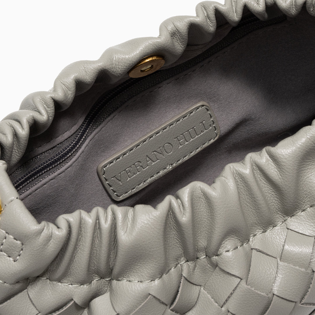 Realizzata in una silhouette morbida effetto cloud e lavorata in pelle vegana di alta qualità, è leggera ma sofisticata. La sua struttura raffinata contiene con facilità tutto il necessario, mentre la tracolla intrecciata dorata aggiunge un tocco di luce e femminilità a ogni outfit.